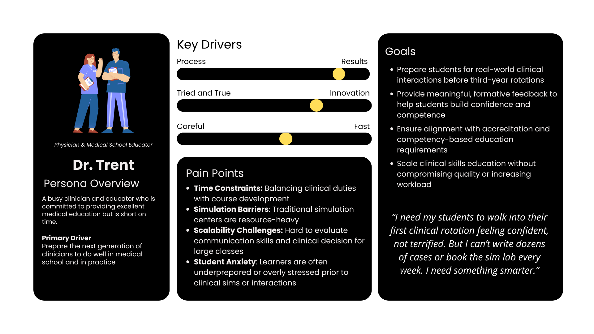 Bringing this product to market as one of the first scalable, AI-powered patient simulation platform for pre-clinical medical education presented both a strategic advantage and a significant challenge. While there was a clear unmet need - educators lacked low-cost, low-stakes ways to help students practice patient interactions - the absence of direct competitors also meant a lack of precedent. Every aspect of the product experience, from the simulation format to the faculty assignment model, had to be built from first principles and rigorously validated through pilots. We had to educate customers on how this new solution fit into their existing workflows, while simultaneously proving that the experience was pedagogically sound and technically reliable. Striking the right balance between innovation and adoption readiness was essential to building credibility in a conservative, high-stakes domain like healthcare education.